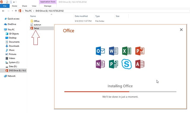 Bila file ISOnya telah terdownload, kalian tinggal membuka file ISOnya tadi. Kemudian jalankan Setup Microsoft Office 2019. Setelah itu, kalian hanya perlu menunggu proses installasi. Prosesnya tergantung pada spesifikasi komputer. Rata-rata proses installasinya yaitu sekitar 10-15 menitan.