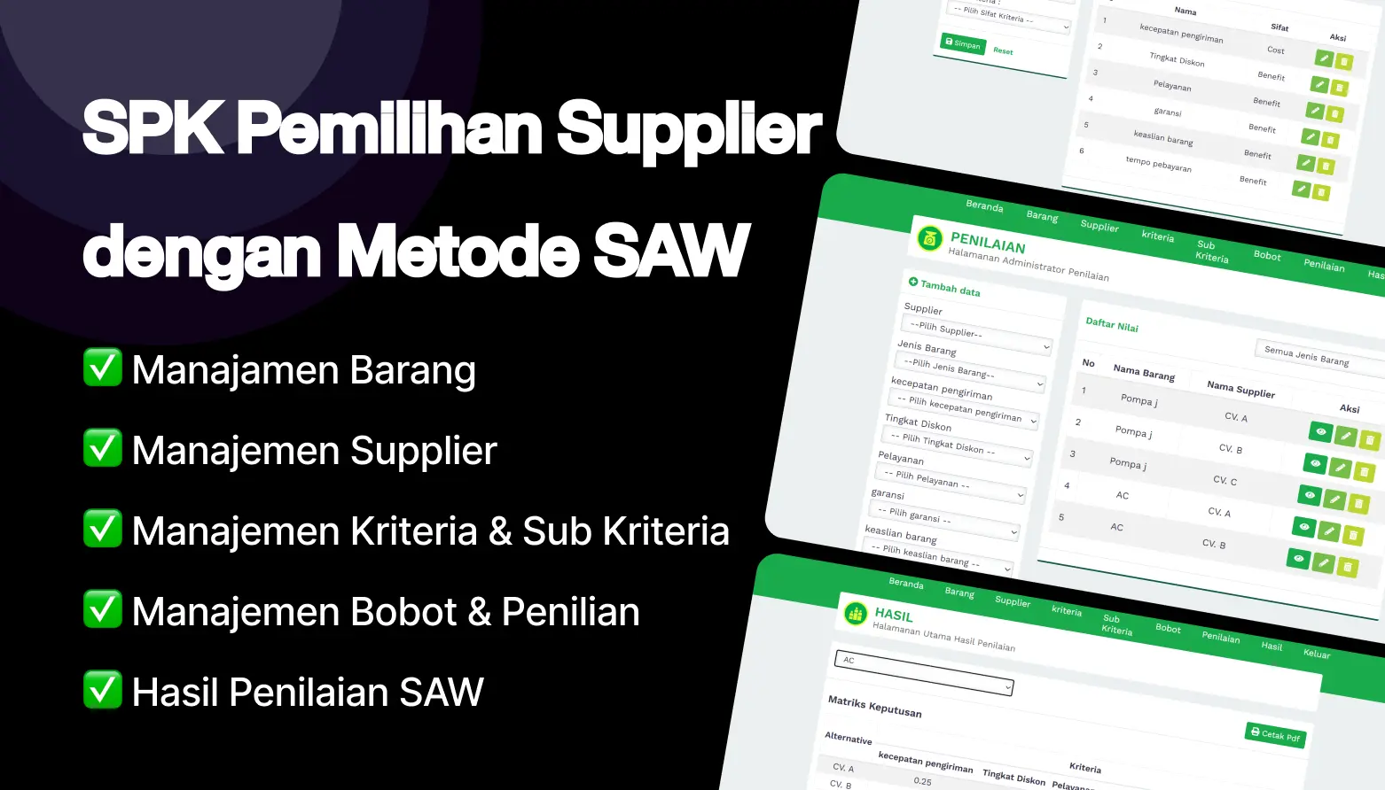 Aplikasi ini dirancang untuk membantu perusahaan, toko, atau instansi dalam menentukan supplier terbaik berdasarkan beberapa kriteria menggunakan metode Simple Additive Weighting (SAW).